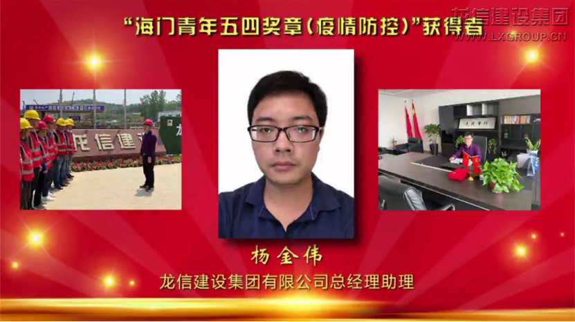 在五四青年節(jié)到來之際,共青團(tuán)海門市委、海門市青年聯(lián)合會(huì)特向優(yōu)秀青年和集體頒發(fā)“海門青年五四獎(jiǎng)?wù)?rdquo;。龍信建設(shè)集團(tuán)有限公司青年志愿服務(wù)隊(duì)榮獲“海門青年五四獎(jiǎng)?wù)录w”,龍信建設(shè)集團(tuán)有限公司總經(jīng)理助理?xiàng)罱饌s獲“海門青年五四獎(jiǎng)?wù)?rdquo;(疫情防控)。4月30日,由海門市新時(shí)代文明實(shí)踐中心辦公室、共青團(tuán)海門市委主辦,海門市融媒體中心承辦,龍信集團(tuán)等單位共同贊助的“不懼風(fēng)雨,奮勇前進(jìn)”——海門市“五四”青年節(jié)線上文明實(shí)踐暨道德講堂總堂示范觀摩活動(dòng)通過電視和網(wǎng)絡(luò)進(jìn)行同步直播,活動(dòng)現(xiàn)場進(jìn)行表彰。