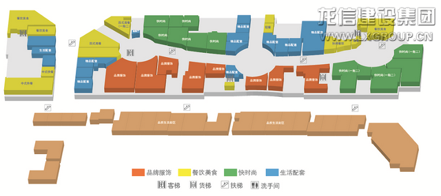 龍信廣場商業(yè)綜合體的購物中心共5.9萬方,其中餐飲業(yè)態(tài)占比34%;休閑娛樂業(yè)態(tài)占比23%;百貨零售業(yè)態(tài)占比32%;超市業(yè)態(tài)占比11%。購物中心共五層,地下一層,地上四層,共有120家商鋪;購物中心共配建918個車位。
